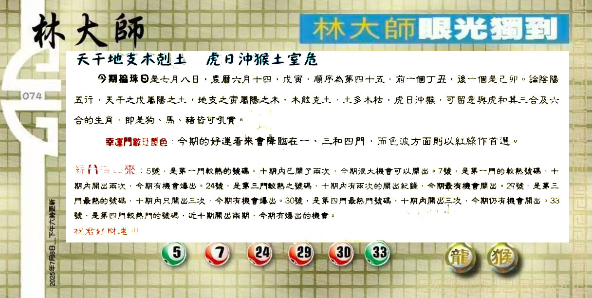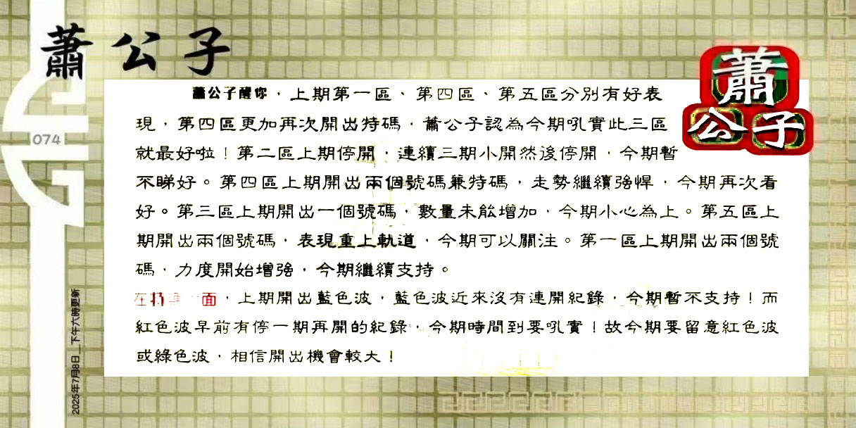 | 主题 :074期:六合皇金句/老总论码/萧公子/林大师/五行夺码/老总信箱截 |