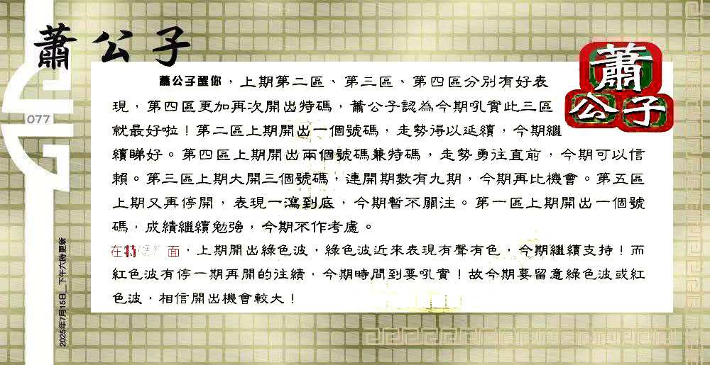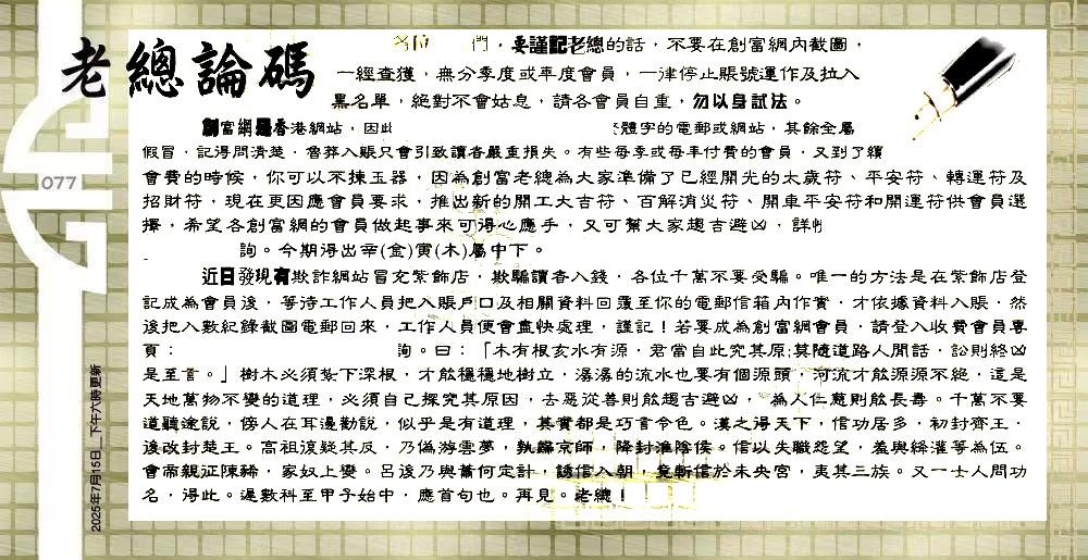 主题 :077期:六合皇金句/老总论码/萧公子/林大师/五行夺码/老总信箱截 |