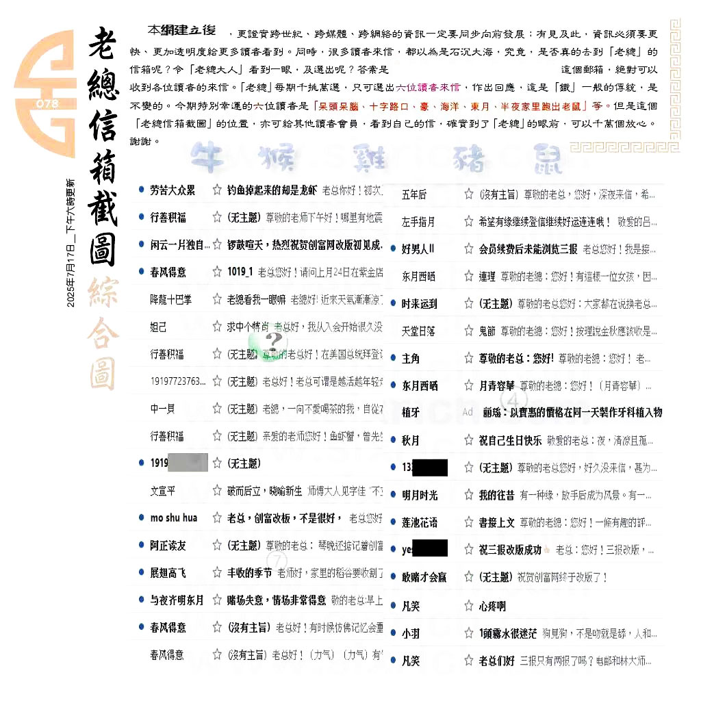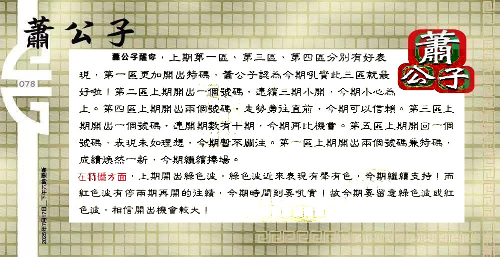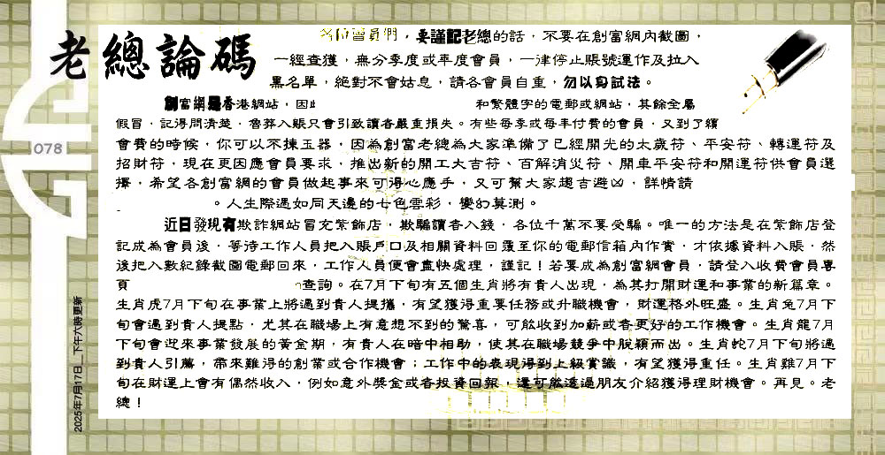 主题 :078期:六合皇金句/老总论码/萧公子/林大师/五行夺码/老总信箱截 |