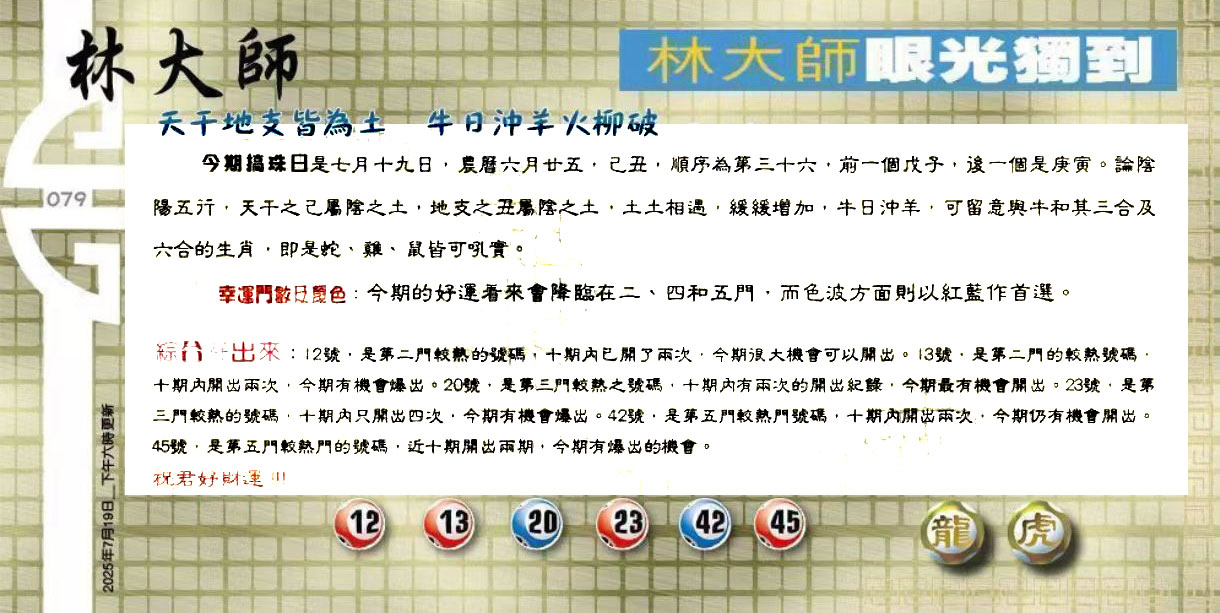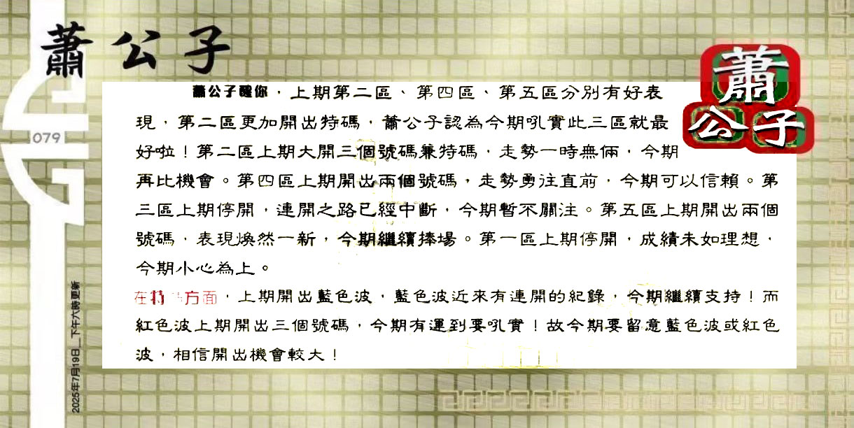 | 主题 :079期:六合皇金句/老总论码/萧公子/林大师/五行夺码/老总信箱截 |