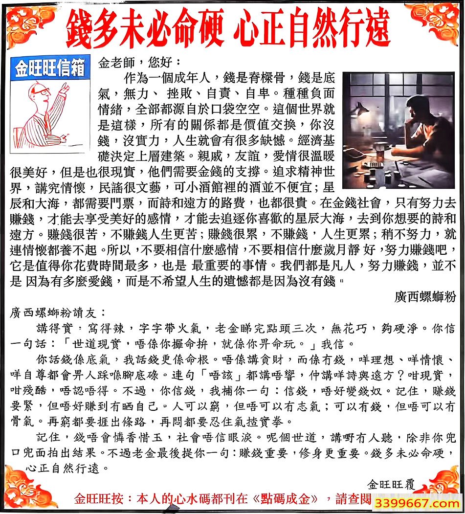 主题 :098期:金旺旺信箱彩民推荐→→《錢多未必命硬 心正自然行遠》 |