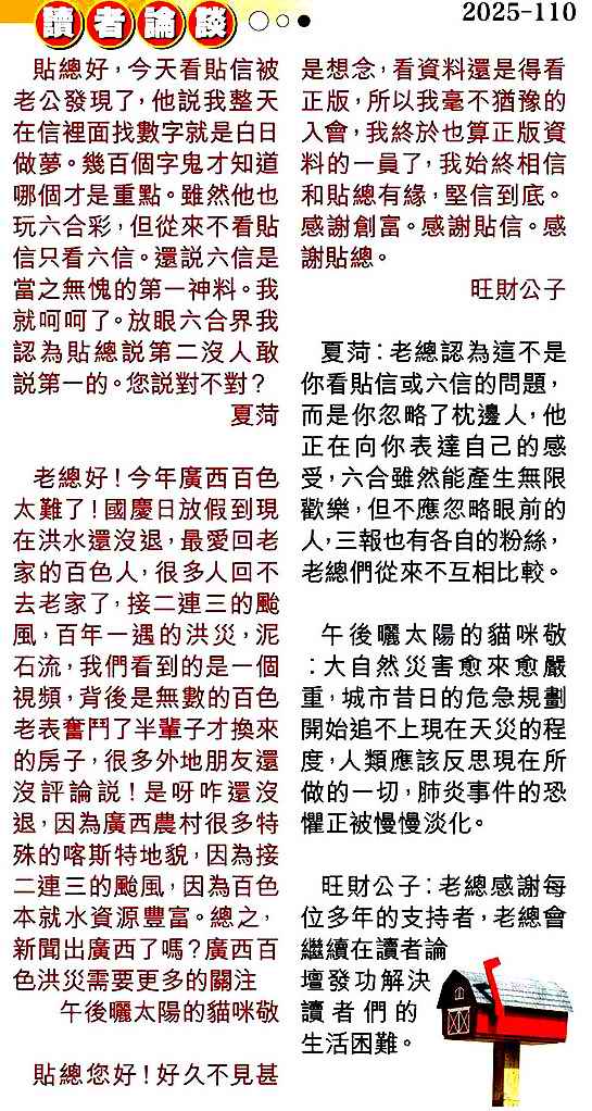 | 主题 :110期:彩民推荐贴信读者论坛 |