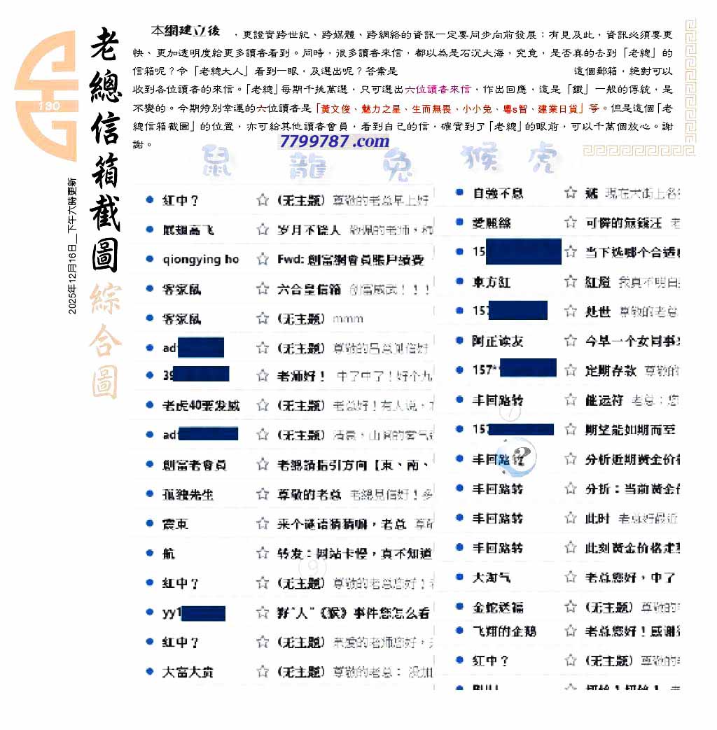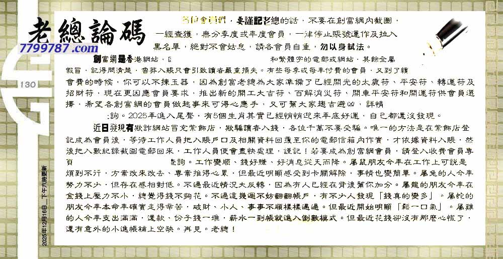 | 主题 :130期:六合皇金句/老总论码/萧公子/林大师/五行夺码/老总信箱截 |