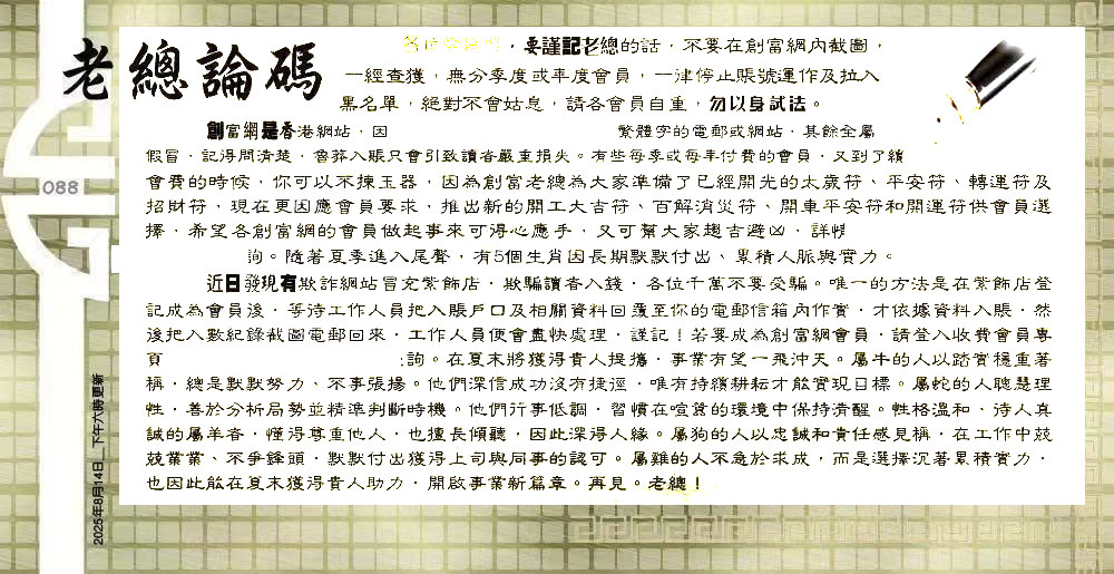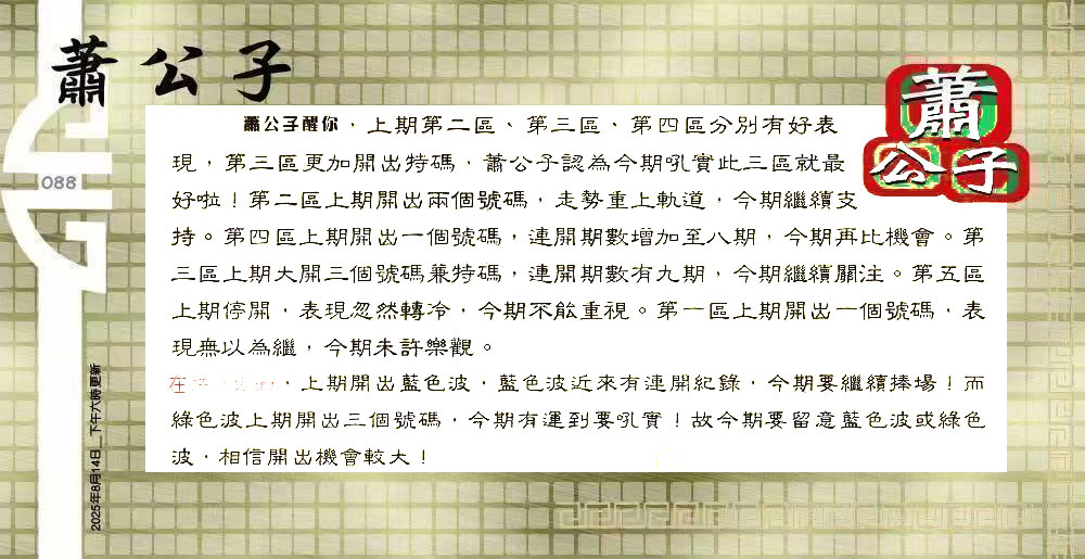 | 主题 :088期:六合皇金句/老总论码/萧公子/林大师/五行夺码/老总信箱截 |