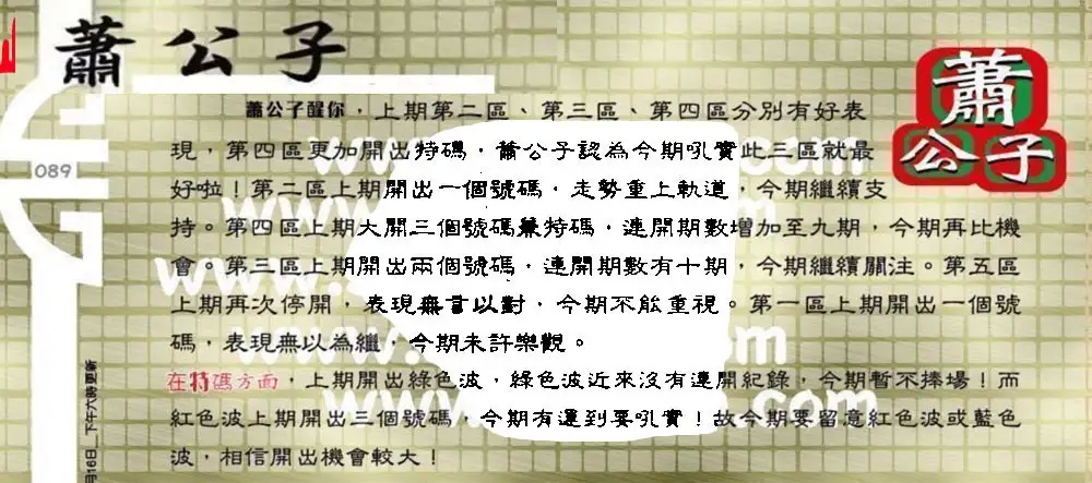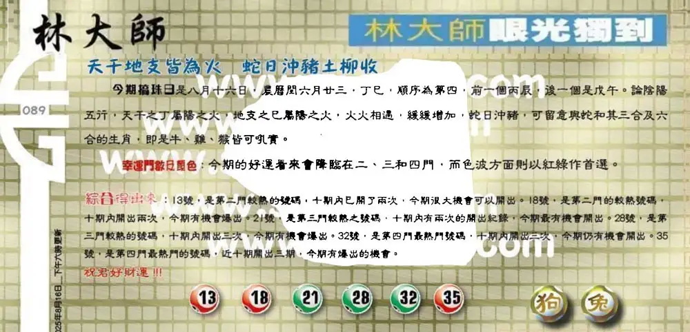 | 主题 :089期:老总论码/萧公子/林大师/五行夺码 |