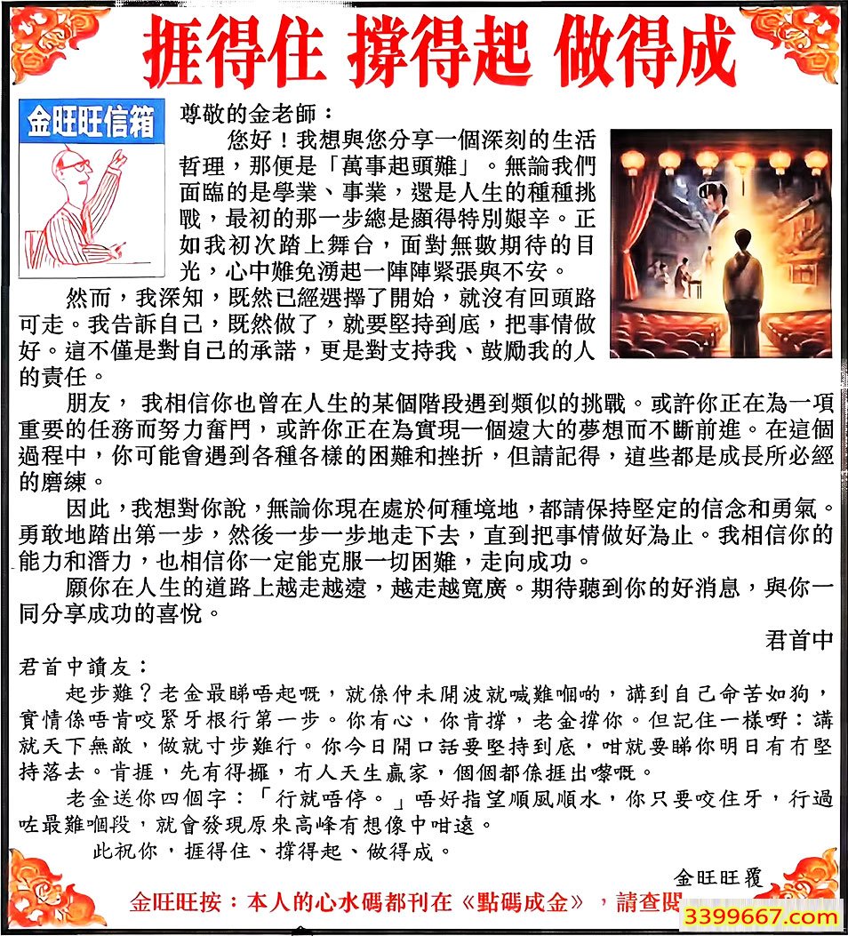 | 主题 :104期:金旺旺信箱彩民推荐→→《捱得起 撐得起 做得成》 |