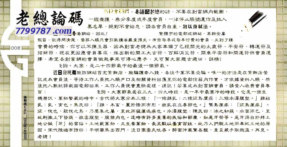 | 主题 :008期:六合皇金句/老总论码/萧公子/林大师/五行夺码/老总信箱截 |