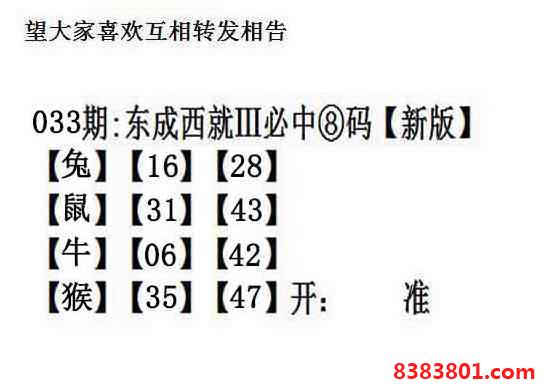 主题 : 033期:另版【东成西就四肖8码】